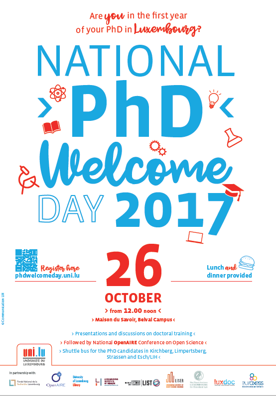 The National PhD Welcome Day 2017 is organised under the lead of the University of Luxembourg, in partnership with OpenAIRE, FNR, LIH, LIST, LISER, MPI, LuxDoc and EURAXESS.
